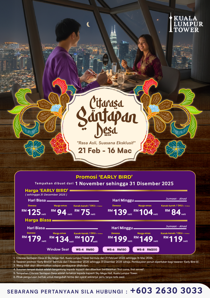 Sempena ketibaan Ramadan Al-Mubarak 1447 Hijrah, Kuala Lumpur Tower sekali lagi mempersembahkan bufet tahunan yang dinanti ramai, Citarasa Santapan Desa “Rasa Asli, Suasana Eksklusif”, yang akan berlangsung dari 21 Februari hingga 16 Mac 2026. Bertempat di Sky Mega Hall pada ketinggian 292 meter dari aras bumi, para tetamu bakal menikmati pengalaman gastronomi istimewa yang menggabungkan…