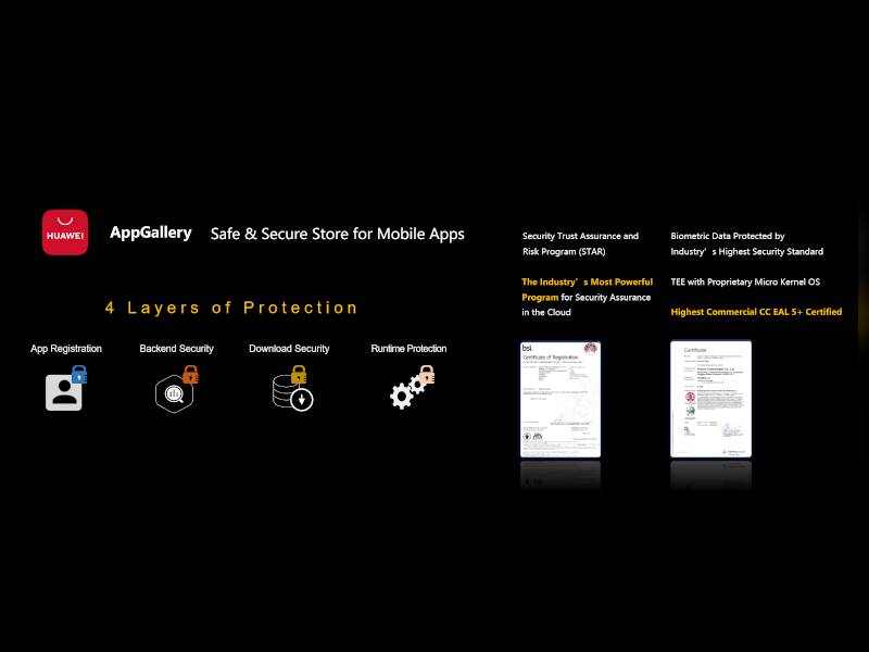 Huawei AppGallery juga diyakini selamat kerana dilindungi empat lapisan perlindungan dan telah dianugerahkan siji keselamatan CC EAL5+.