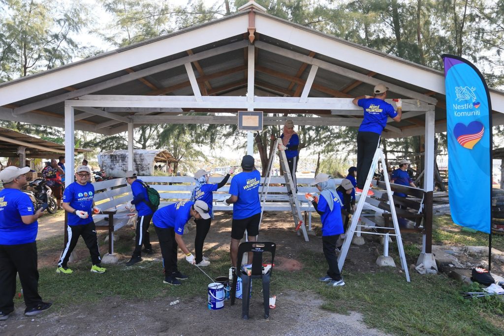 Sukarelawan Nestlé membantu membina dan mengecat pondok nelayan di Pantai Tok Jembal bagi memberikan wajah baharu untuk kegunaan komuniti setempat.