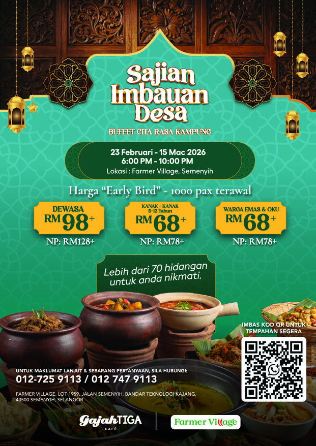 Sementara itu, Pengarah Syarikat Gajah Tiga, Nazri Hendra, berharap kerjasama ini dapat memperkukuh dan menaikkan nama kedua-dua restoran dalam arena masakan Melayu. Buffet Ramadan Sajian Imbauan Desa bakal bermula pada 23 Februari 2026, dengan harga bermula dari RM78 hingga RM128. Menariknya, 1,000 pelanggan terawal berpeluang menikmati harga ‘early bird’ serendah RM68 hingga RM98, menjadikan pengalaman berbuka puasa ini lebih berbaloi.
