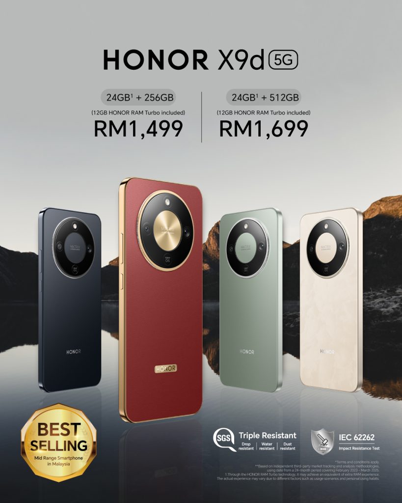The HONOR X9d 5G comes in two variants: 24GB RAM (including 12GB HONOR Turbo RAM) with 256GB storage priced at RM1,499, and a 512GB storage version at RM1,699. It is available in four elegant colors — Reddish Brown, Forest Green, Sunrise Gold, and Midnight Black. Customers can purchase the smartphone from HONOR Experience Stores, HONOR’s online store, as well as Lazada, Shopee, TikTok flagship stores, and authorized dealers such as Harvey Norman, Senheng, SenQ, and Urban Republic.