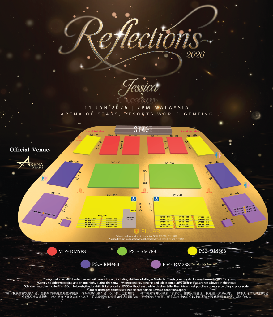 Tickets for Jessica Concert Tour 2026 in Malaysia will go on sale starting November 20, 2025 (Thursday) at 3 PM via www.fantopia.io and www.rwgenting.com. Ticket prices are RM988 (VIP), RM788 (PS1), RM588 (PS2), RM488 (PS3), and RM288 (PS4), with an additional RM4 processing fee. Fans can stay tuned for updates and exclusive content by following @ht.entertainmentcompany on Instagram.