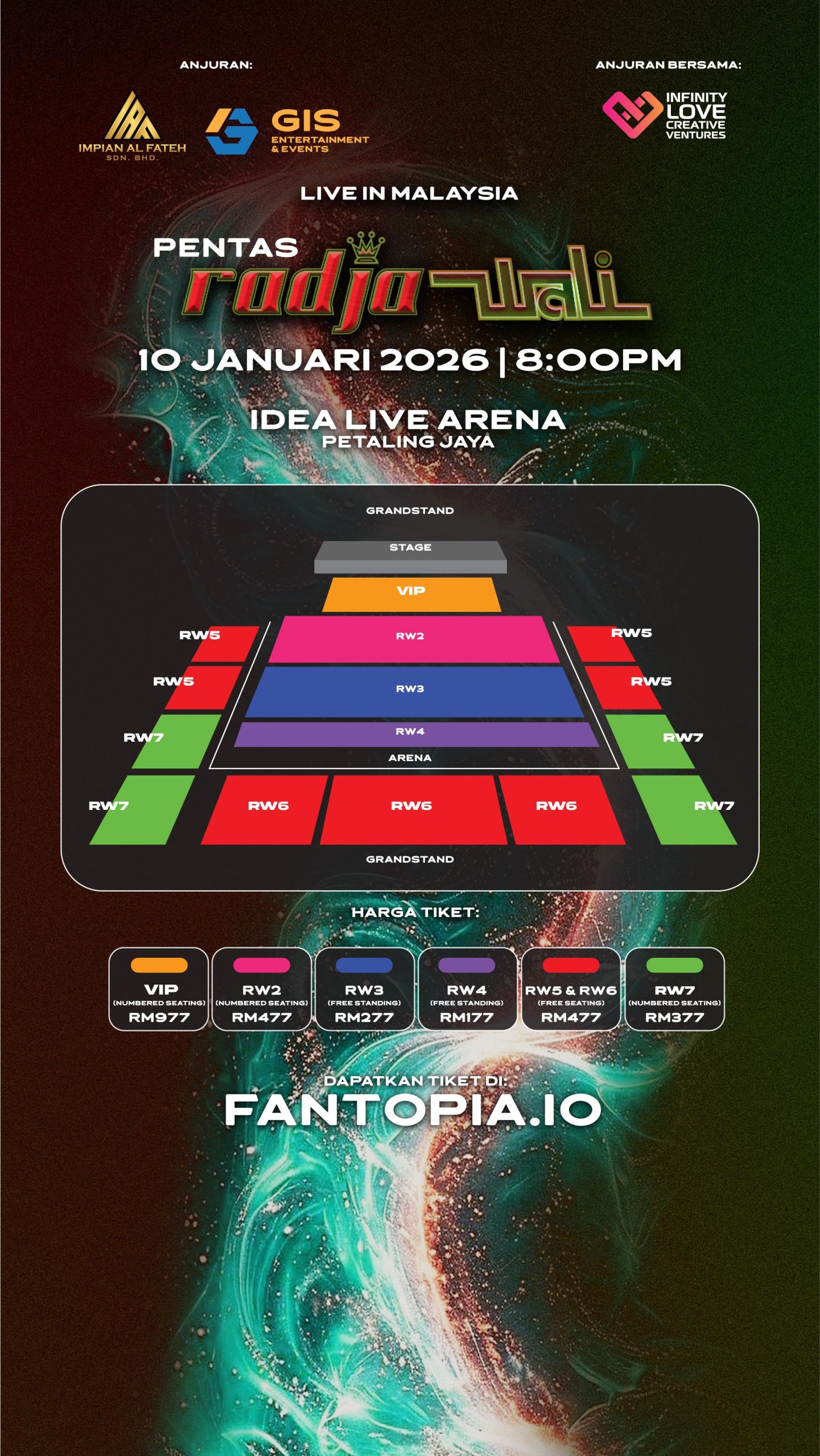 Pentas RadjaWali Live in Malaysia dianjurkan oleh Impian Al Fateh Sdn. Bhd. dan GIS Entertainment & Events, dengan Infinity Love Creative Ventures (ILCV Events) sebagai penganjur bersama. Tiket-tiket kini mula dijual melalui Fantopia.io dan juga boleh dibeli dengan lebih mudah menggunakan ShopeePay.