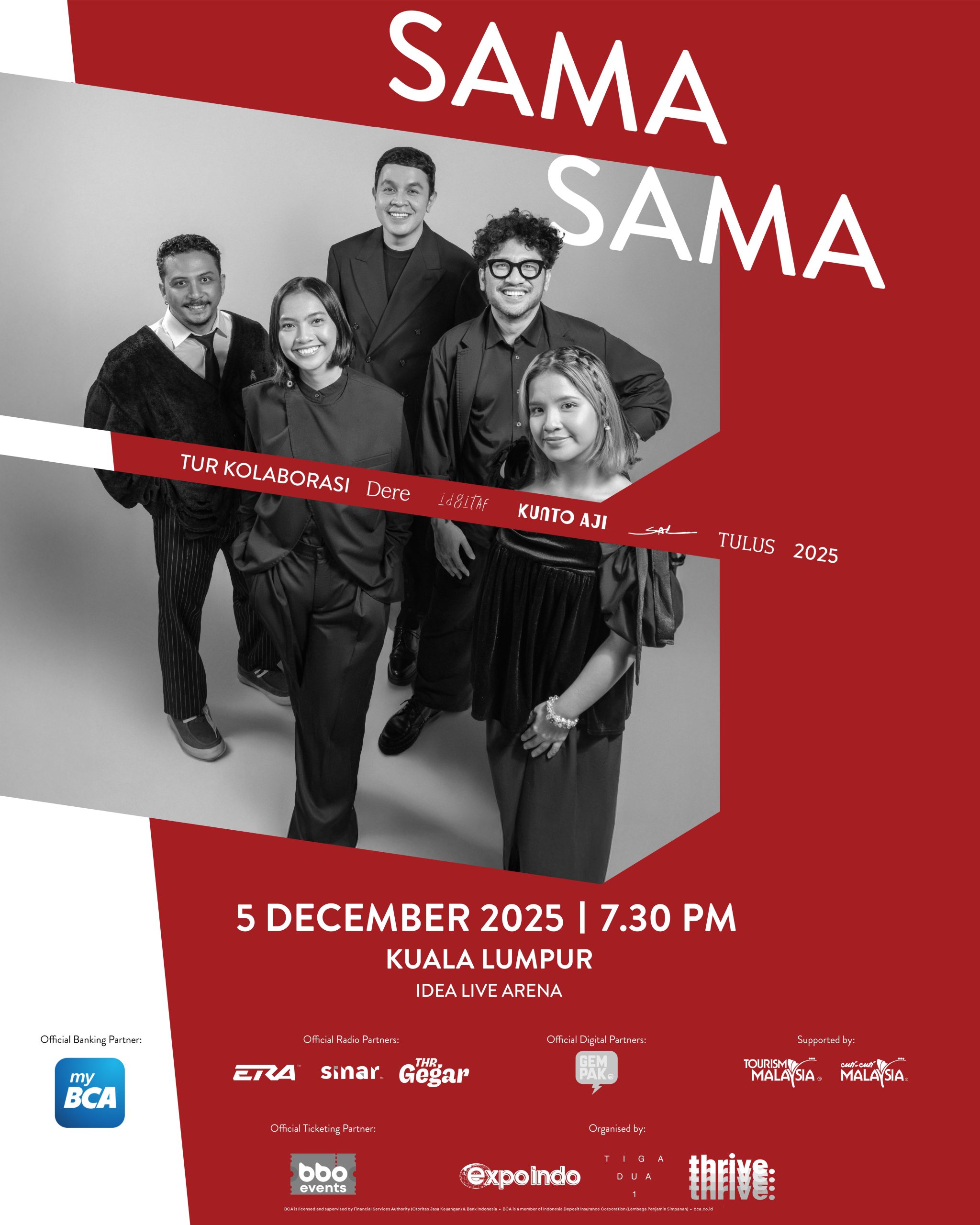 Selepas kejayaan luar biasa di empat kota Indonesia iaitu Bandung, Surabaya, Yogyakarta dan Bogor, kini giliran peminat di Malaysia untuk menikmati sebuah pertunjukan kolaborasi muzik paling ditunggu-tunggu tahun ini. Untuk informasi terkini mengenai Tur SAMA SAMA, peminat boleh mengikuti perkembangan di media sosial rasmi @thriveevents_my.
